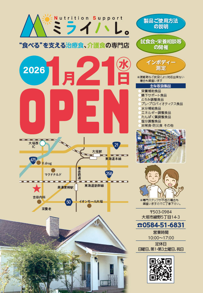治療食・介護食専門店「ミライハレ。」は、令和8年1月21日(水)に新規オープンいたします!